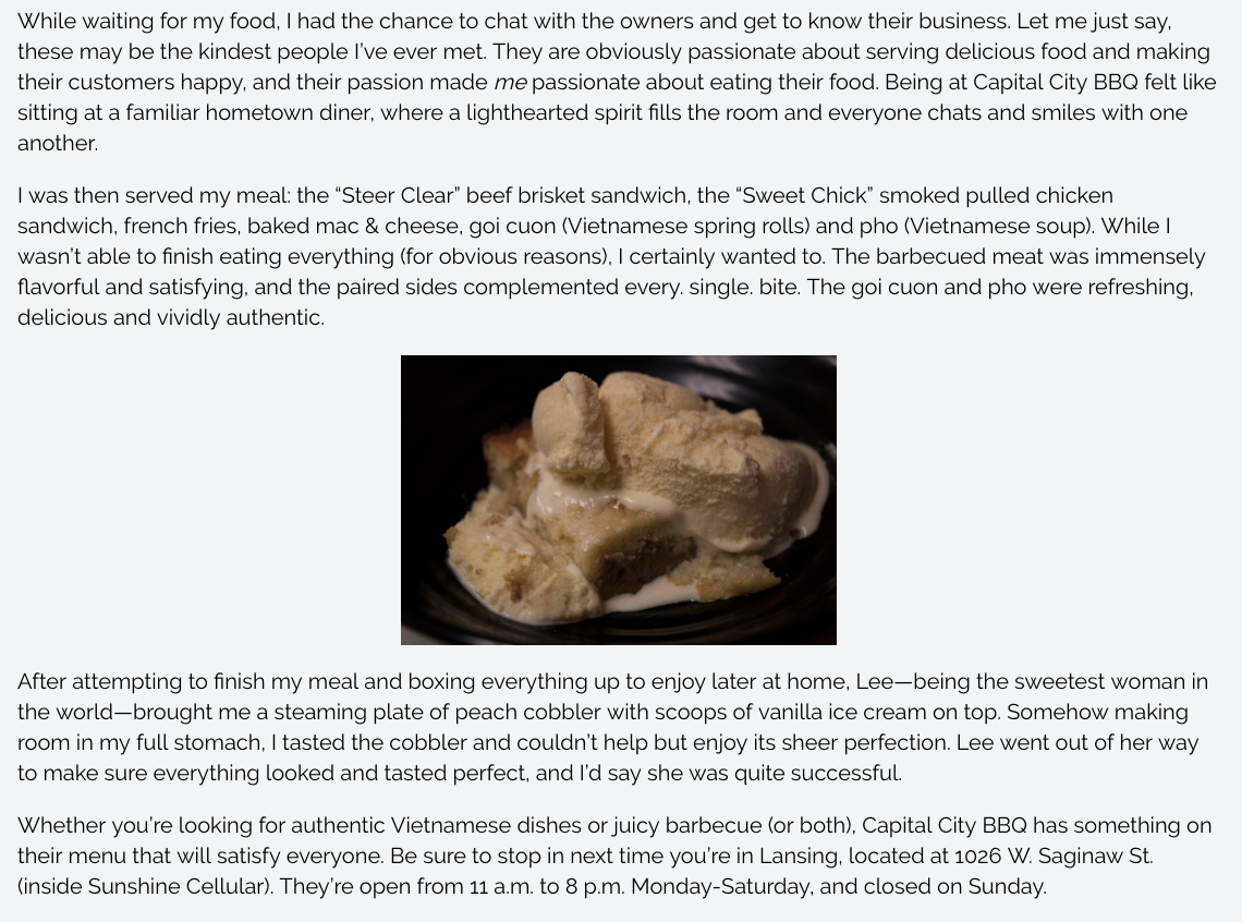 Blog writing is such an interesting medium, as blogs can be fun, provocative, informational, or all of the above! I love writing blog pieces because of the creative range I’m allowed, while also appealing to diverse audiences. Some of my favorite blog topics are lifestyle related—and I loooove tasting and reviewing restaurants. Below is a writing sample from my time with ing Magazine, highlighting a local Lansing BBQ joint.
